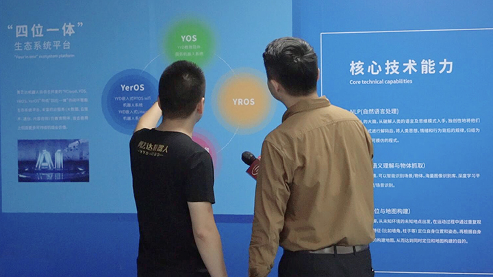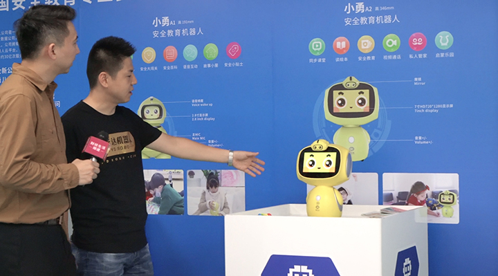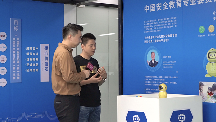 勇艺达机器人副总裁贾湛带着主持人前往公司展厅,一一了解目前主打款机器人的功能亮点。随后在访谈中就公司目前的产品定位和未来发展提到:作为一家人工智能大数据公司,勇艺达根据市场需求和相关分析报告,目前公司产品定位针对C端的安全教育机器人和针对B端的安全服务机器人。